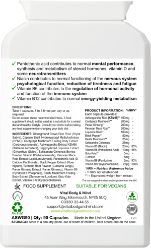 Ingredients: Vitamin C (Ascorbic Acid), Baobab Fruit Pulp (Adansonia Digitata), Capsule: Hydroxypropyl Methylcellulose (HPMC), Stoneground Brown Rice Flour (Gluten Free) (Oryza Sativa), Acerola Extract (Malpighia Glabra), Citrus Bioflavonoids Complex, Zinc Citrate, Vitamin E as D-alpha tocopheryl succinate, Grapefruit Seed Extract (Citrus Paradisi), Olive Leaf Extract (Olea Europaea), Bioperine (Piper Nigrum), Elderberry Extract (Sambucus Nigra), Cayenne Pepper Extract (Capsicum Annuum), Reishi Mushroom Fruiting Body Extract (Ganoderma Lucidum), Selenomethionine (Calcium Phosphate), Turmeric Root Extract (Curcuma Longa), Vitamin B6 (Pyridoxine Hydrochloride), Rosehip Extract (Rosa Canina), Vegan Vitamin D3 (Cholecalciferol), Lactobacillus Acidophilus, Ginger Root Extract (Zingiber Officinale), Black Garlic Extract (Allium Sativum).