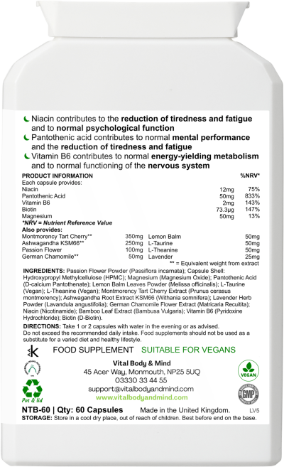 INGREDIENTS: Passion Flower Powder (Passiflora incarnata); Capsule Shell: Hydroxypropyl Methylcellulose (HPMC); Magnesium (Magnesium Oxide); Pantothenic Acid (D-calcium Pantothenate); Lemon Balm Leaves Powder (Melissa officinalis); L-Taurine (Vegan); L-Theanine (Vegan); Montmorency Tart Cherry Extract (Prunus cerasus montmorency); Ashwagandha Root Extract KSM66 (Withania somnifera); Lavender Herb Powder (Lavandula angustifolia); German Chamomile Flower Extract (Matricaria Recuitita); Niacin (Nicotinamide); Bamboo Leaf Extract (Bambusa Vulgaris); Vitamin B6 (Pyridoxine Hydrochloride); Biotin (D-Biotin).