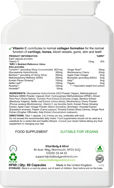 This vegan food supplement has been formulated to provide a tailored combination of glucosamine HCl, Methylsulphonyl Methane (MSM), vitamin C and other herbal and food-based ingredients, including: turmeric extract (with curcuminoids), nettle leaf, Montmorency cherry, Korean panax ginseng, apple cider vinegar powder, bromelain, horsetail herb, kelp, papain, rosehip and ginger root – all in one easy-to-take formula.
