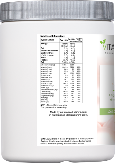 A delicious drink mix, which contains high-strength, high quality hydrolysed collagen (collagen peptides) – 10g / serving – plus glucosamine HCl (800mg / serving), vitamins and minerals.