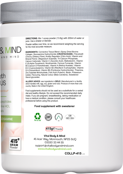 Ingredients: Connective Tissue Blend: (Spray Dried Bovine Collagen, Glucosamine Hydrochloride (CRUSTACEANS); Fibruline® (Chicory (Dietary) Fibre); Acidity Regulator (Citric Acid); Vitamin and Mineral Premix: (Magnesium Sulphate, Tri-Calcium Phosphate, Calcium Carbonate, Vitamin C (Ascorbic Acid), Maltodextrin, Vitamin E (Dl-Alpha Tocopherol), Nicotinamide, Ferrous Fumarate, Vitamin B5 (Calcium D Pantothenate), Vitamin A (Retinyl Acetate), Vitamin B12 (Cyanocobalamin), Vitamin B2 (Riboflavin 5-phosphate), Vitamin D3 (Cholcalciferol), Vitamin B6 (Pyridoxine Hydrochloride), Thiamine, Zinc Sulphate Monohydrate, Folic Acid (Folacin), Biotin, Potassium Iodide); Flavouring, Natural Colour (Beta Carotene), Sweetener: Steviol glycosides.