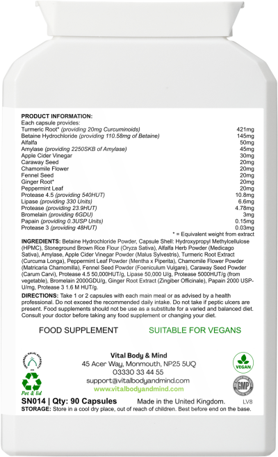 Plant-derived digestive enzymes (betaine hydrochloride, lipase, amylase, protease, bromelain and papain), combined with a range of herbs (alfalfa, apple cider vinegar powder, caraway seed, chamomile, fennel seed, ginger root, peppermint leaf and turmeric root, with curcuminoids).