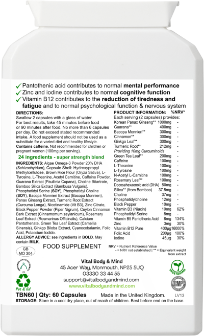 This unique and comprehensive formula contains a special combination of herbs, vitamin and mineral ingredients that support both cognitive function and energy levels, by providing valuable additional nutritional energy to your brain and body – backed by science (see below).