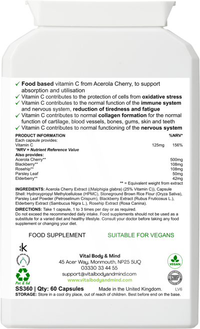 INGREDIENTS: Acerola Cherry Extract ((Malphigia glabra) (25% Vitamin C)), Capsule Shell: Hydroxypropyl Methylcellulose (HPMC), Stoneground Brown Rice Flour (Oryza Sativa), Parsley Leaf Powder (Petroselinum Crispum), Blackberry Extract (Rubus Fruticosus L.), Elderberry Extract (Sambucus Nigra L.), Rosehip Extract (Rosa Canina).